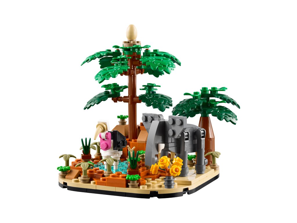 - Propracovaný výstavní kousek s motivem přírody – Model LEGO® Africká savana – diorama obsahuje figurku slona a čápa a zobrazuje scenérii savany se spoustou detailů, které můžete objevovat