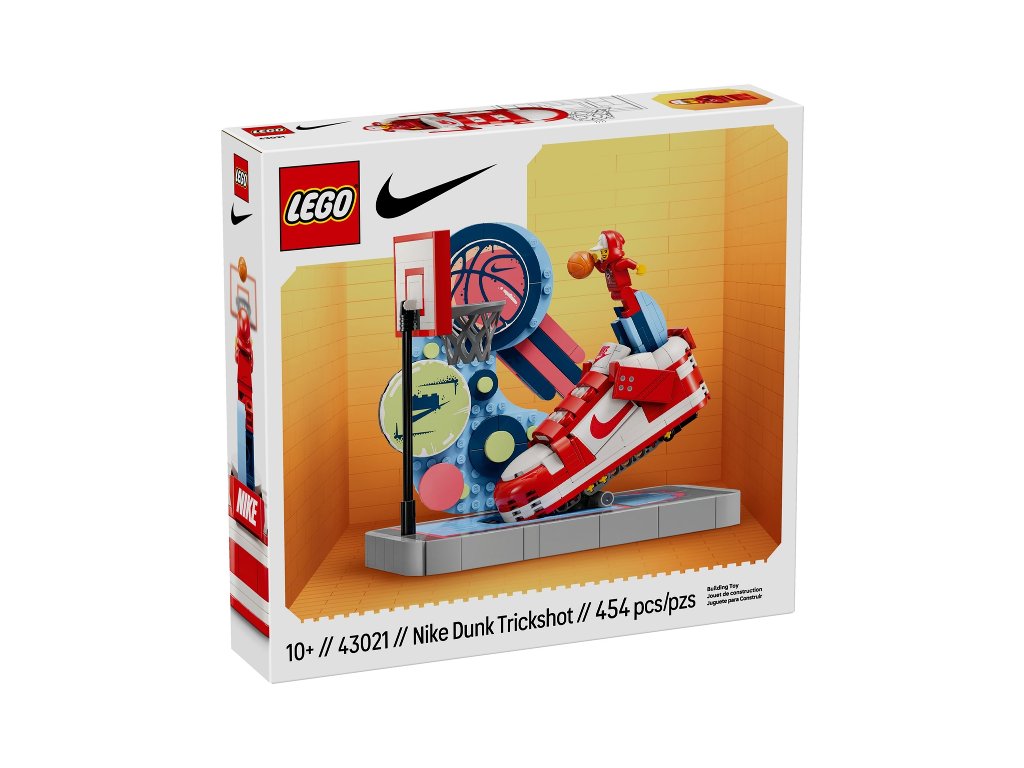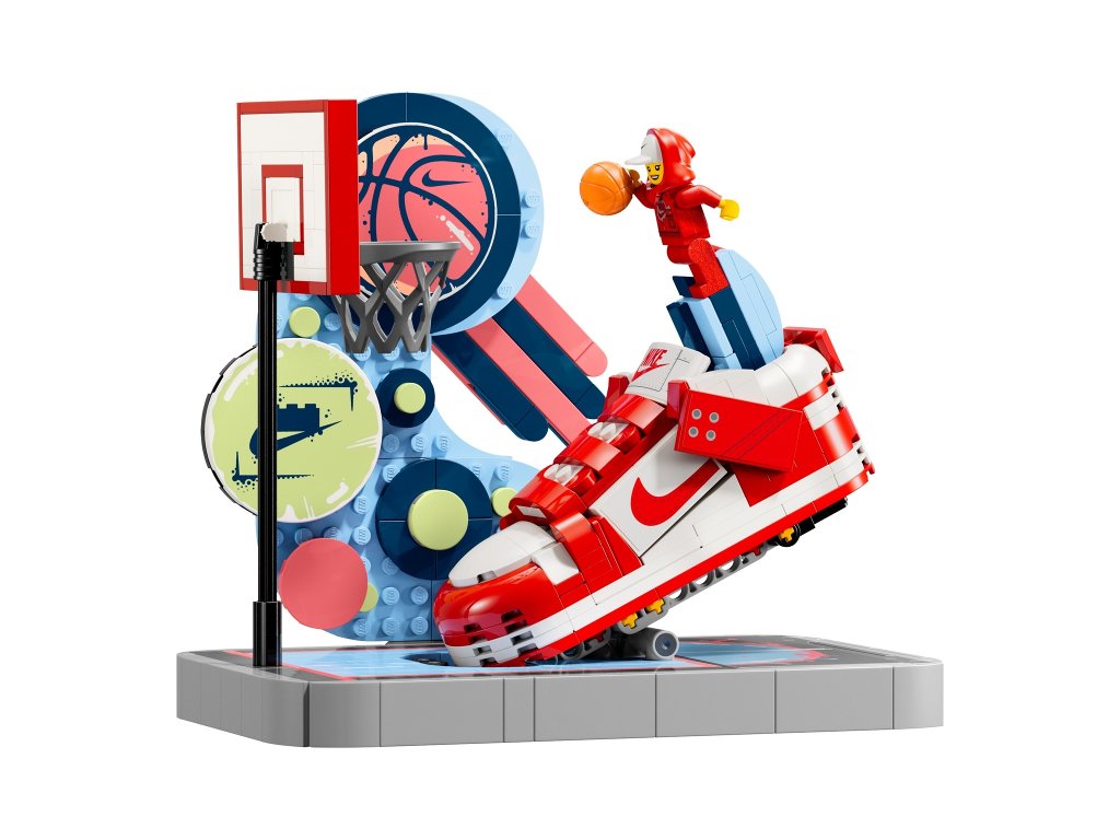 Malé basketbalové hvězdy si postaví umělecké pozadí ve stylu graffiti a pak se pustí do skládání nízké tenisky a basketbalového koše. Teniska je navržena podle ikonického designu Nike Dunk a dokonce je k dispozici ve stejném barevném provedení jako původní tenisky. Tato teniska je ale výjimečná – je vybavena miniaturní páčkou, kterou mohou děti stisknout a zinscenovat tak smečování. Tenisku pak mohou z modelu vyjmout a zastřílet si na koš. Modelu vdechuje život exkluzivní minifigurka se 2 vyměnitelnými hlavami a mikinou navrženou v rámci kolekce LEGO Nike.