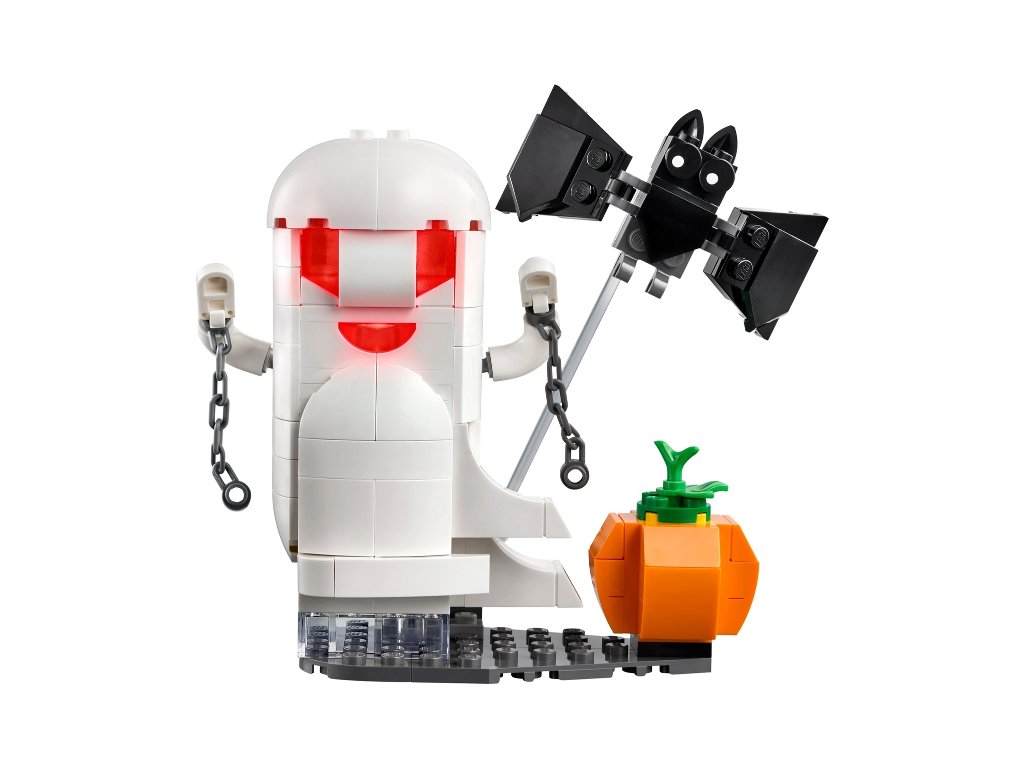 - Svítící halloweenská hračka – Děti stisknou rukojeť na zádech ducha z kostek LEGO® a aktivují světelnou kostku, která osvítí duchovy oči a ústa děsivou červenou září