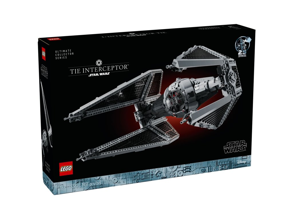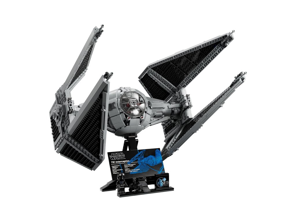 Tato sběratelská stíhačka z kostek měří přes 40 cm na délku a součástí je podstavec na vystavení s informační cedulkou, kostkou k 25. výročí LEGO Star Wars a místem pro minifigurku pilota stíhačky TIE a figurkou LEGO myšího droida.