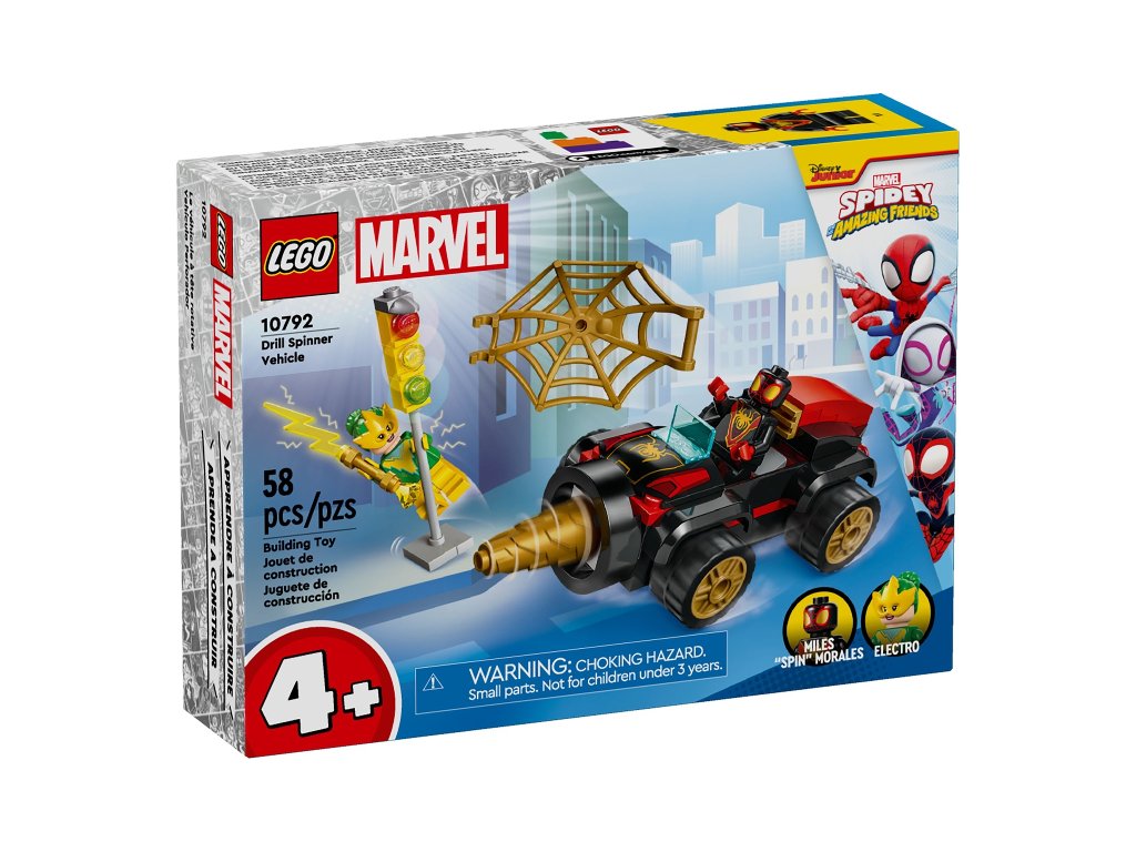 Součástí stavebnice na motivy televizního seriálu Spidey a jeho úžasní přátelé od Disney+ je Spider-Manovo auto s otáčecím vrtákem, minifigurka Milese „Spin“ Moralese a minifigurka Electro. Nechybí začátečnická kostka podvozku, se kterou se děti snadno pustí do stavění. Součástí je také návod v podobě zábavného obrázkového příběhu.
