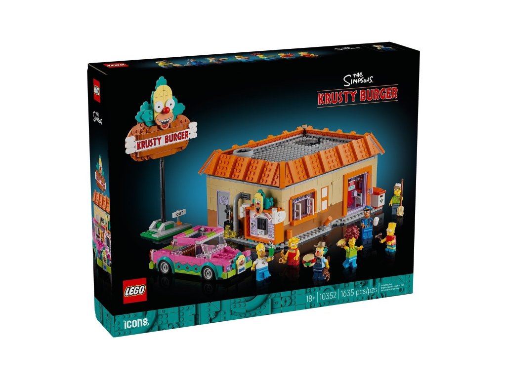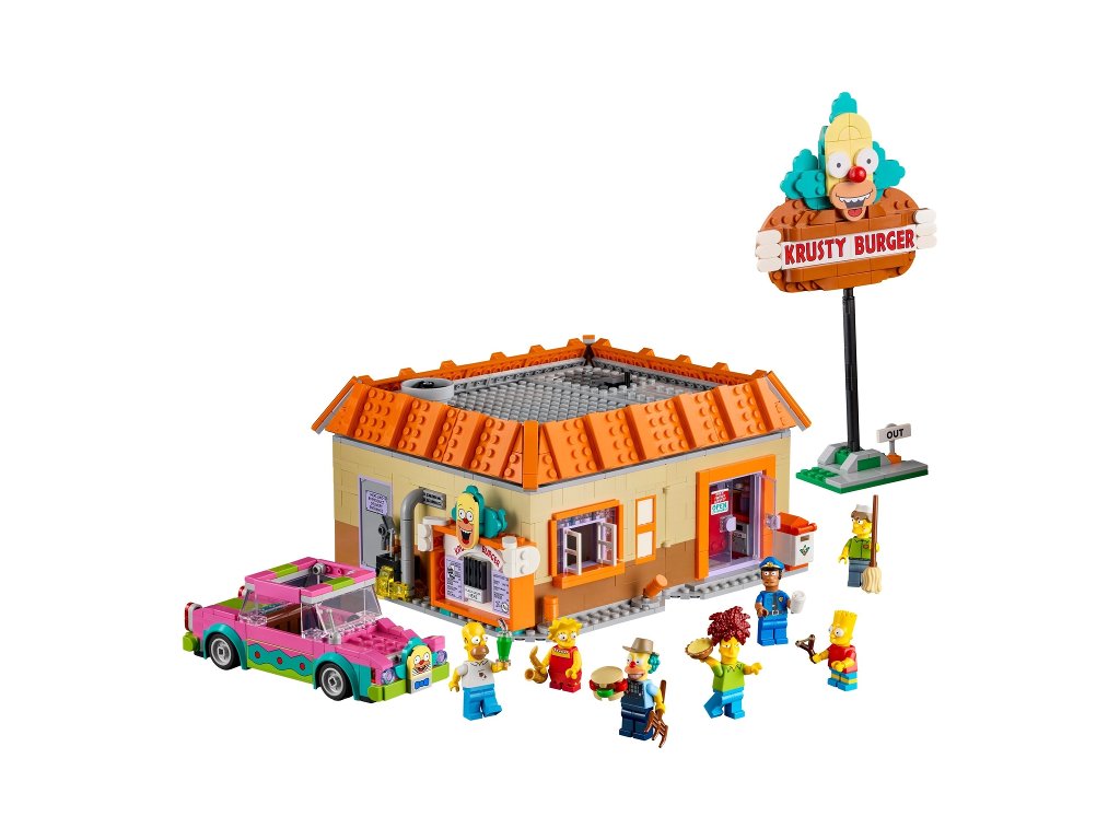 - Co najdete v krabici – Restauraci The Simpsons™: Krusty Burger, ceduli na tyči, Homerovo klaunské auto a minifigurky Homera, Barta a Lisy Simpsonových, Šáši Krustyho, Leváka Boba, teenagera s piskavým hlasem a policisty Loua